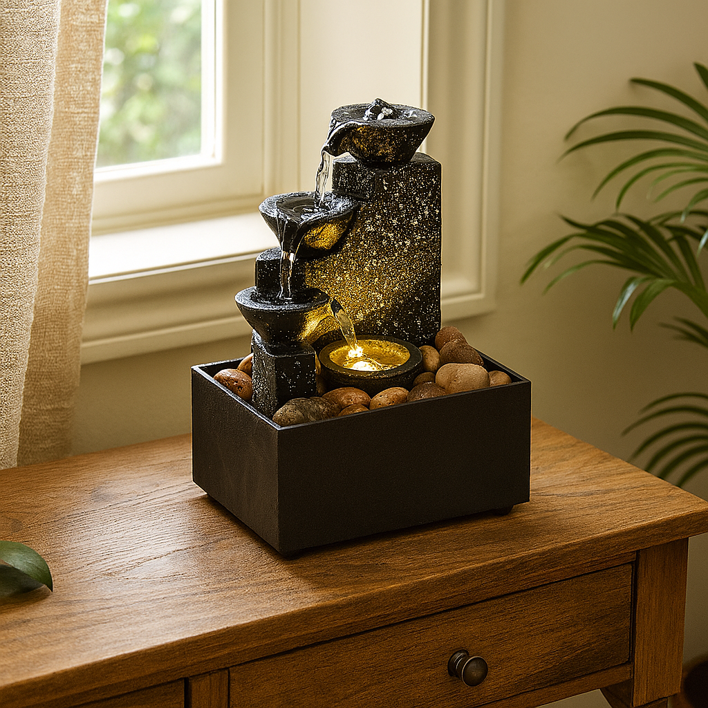PERCHÉ SCEGLIERE AQUAGLOW – FONTANELLA DA TAVOLO ZEN CON CASCATA A LIVELLI E ILLUMINAZIONE LED?